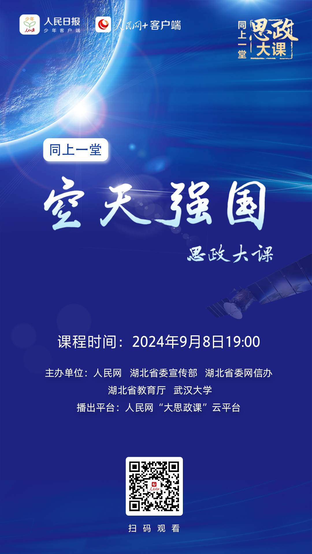 课程视频将于9月8日19:00在“人民网+”客户端及人民日报少年客户端播出,“人民网”微信公众号、“人民网教育”微信公众号、“湖北省教育厅”微信公众号及视频号同步提供学习观看视频。请各单位积极组织师生员工观看。